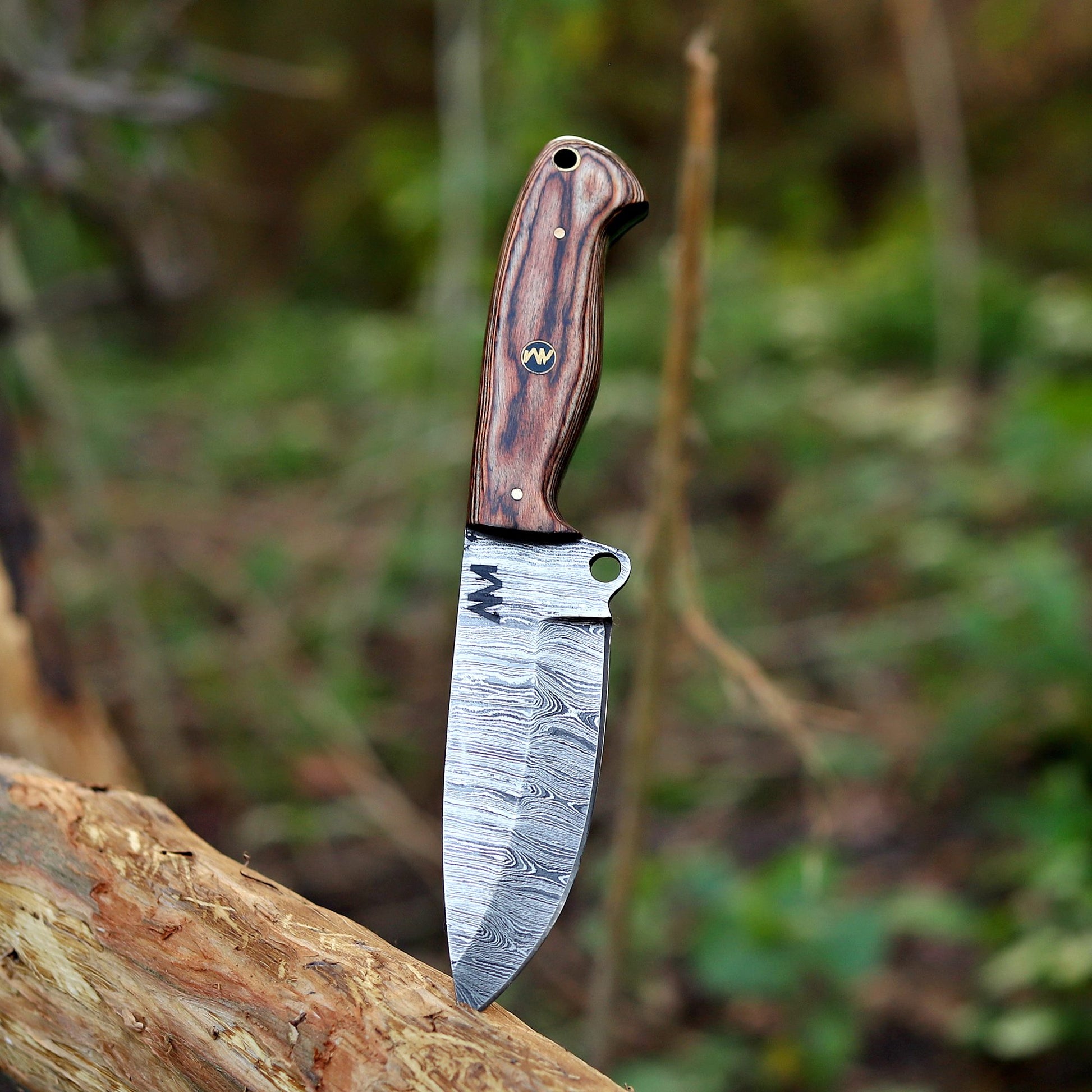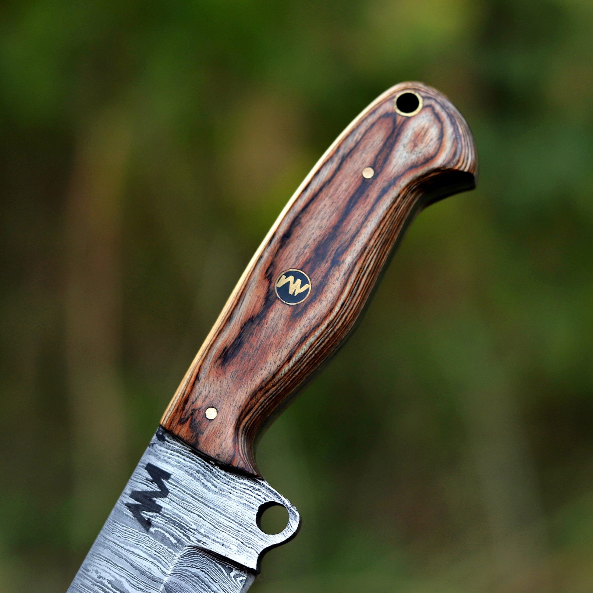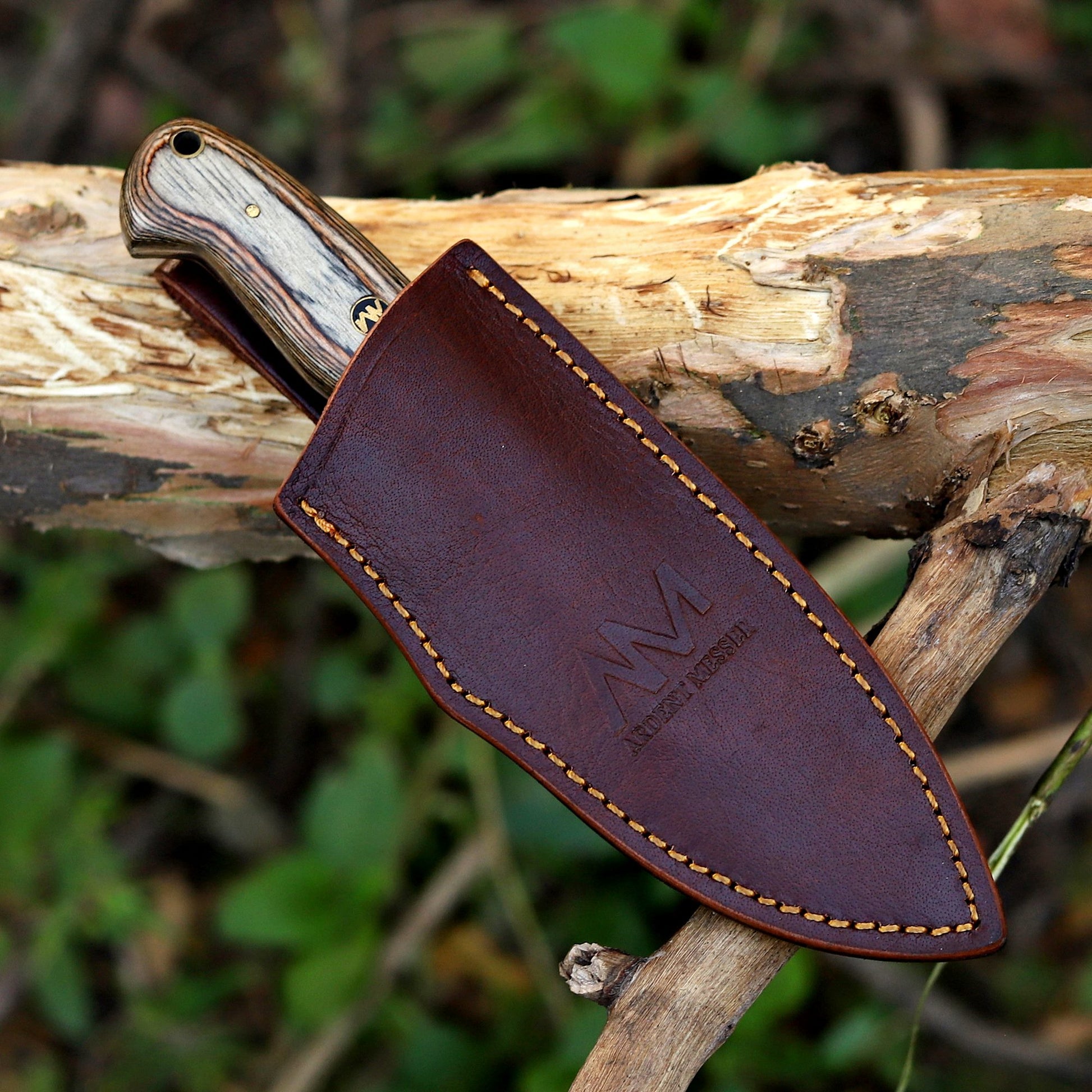The full tang construction delivers unwavering balance and strength, while the contoured rich grains laminated wood handle offers a grip that feels alive — warm, grounded, and built for endurance. Housed in a custom vertical-carry leather sheath, this knife is as ready for the field as it is for the forge.